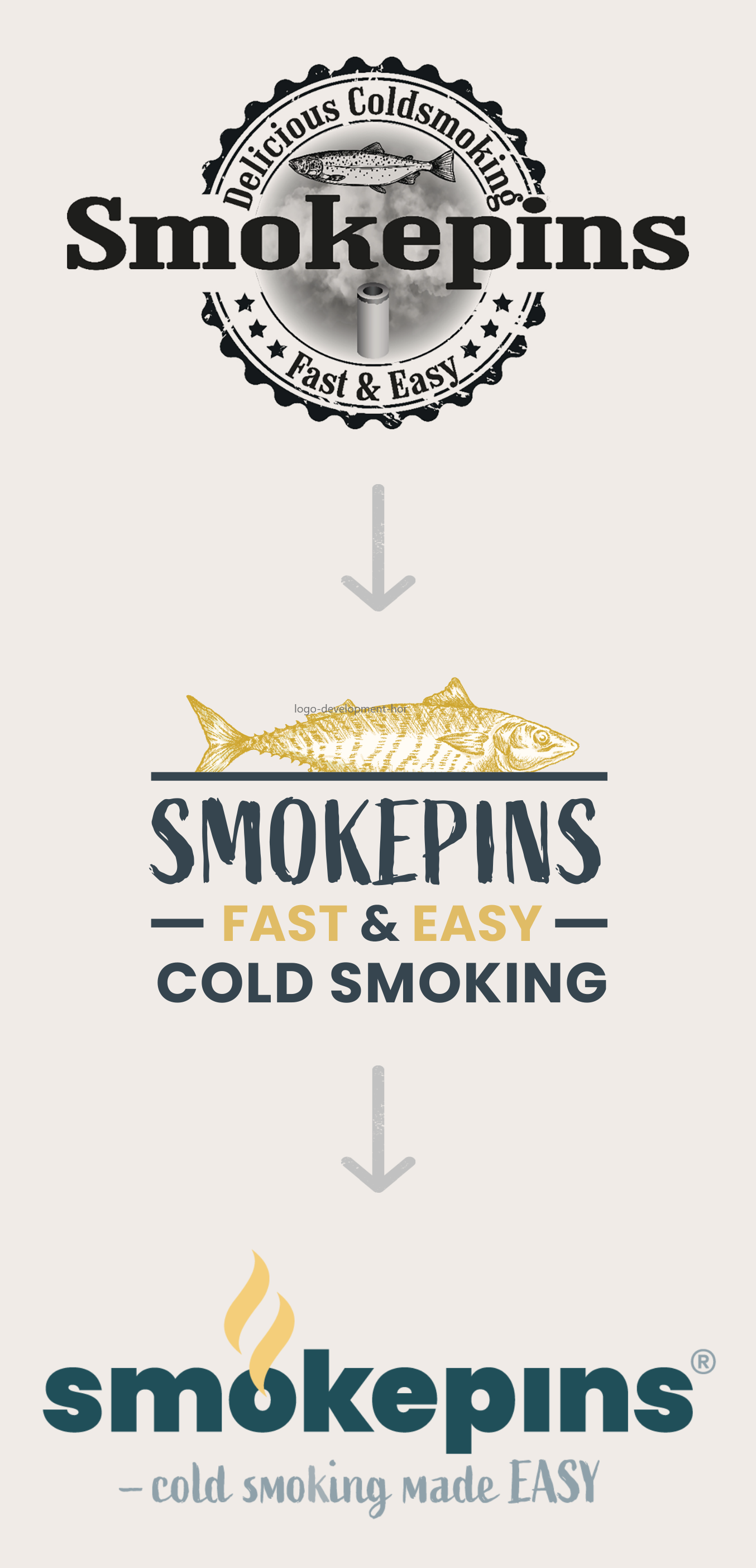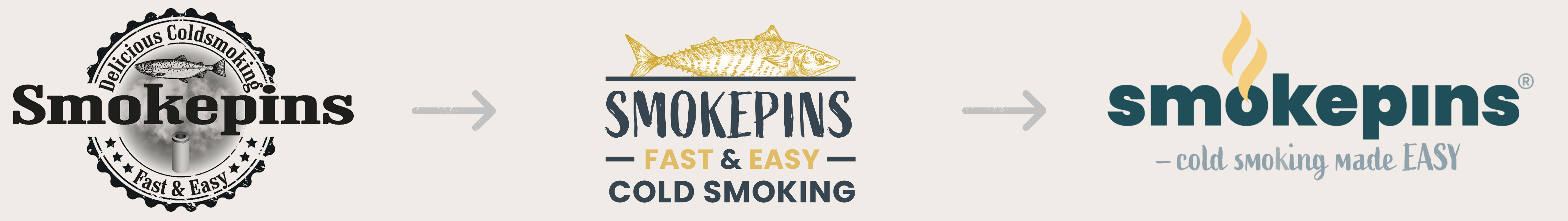Det første logo var det Smokepins havde da vi begyndte at arbejde med dem. Herefter ses det logo som vi har udarbejdet. Til sidst er logoet som firmaet endte ud med at designe selv, og som de benytter den dag idag.